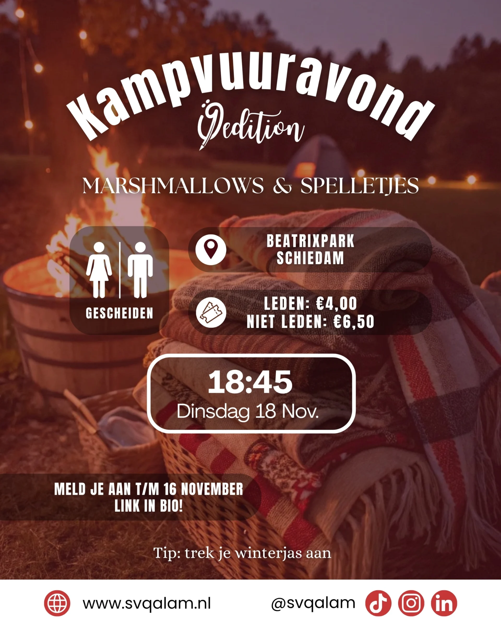 Wat jou onder andere te wachten staat:😋 Heerlijke marshmallows en andere snacks🔥 Een warme kampvuur🧩 Spelletjes zoals: weerwolven, imposter en nog veel meer