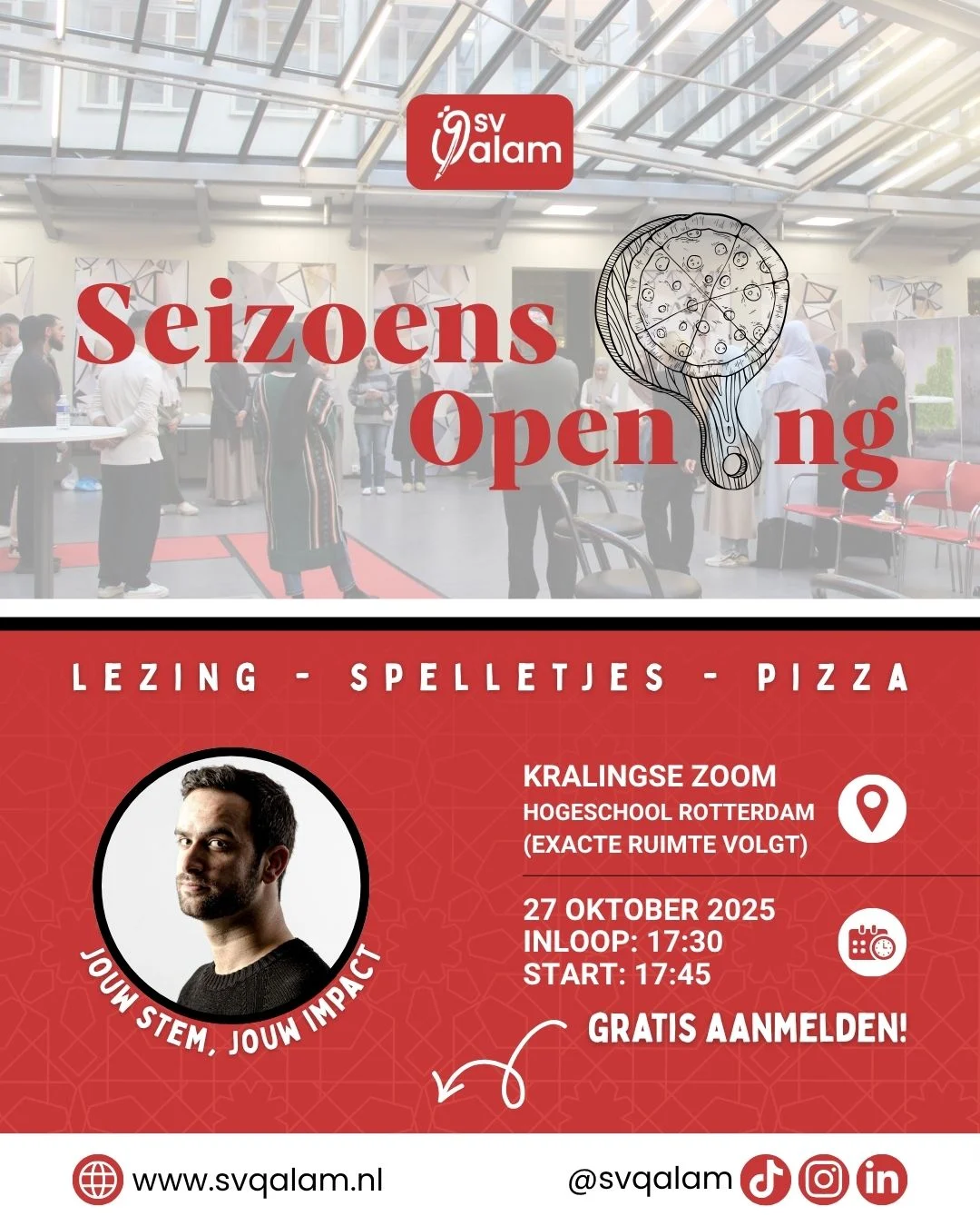 Op het programma staat: 1️⃣ Een lezing van Halil Karaaslan over een hele actuele onderwerp.2️⃣ Gevolgd door spelletjes voor gezelligheid 🎮.3️⃣ En héél veel PIZZA! 🍕